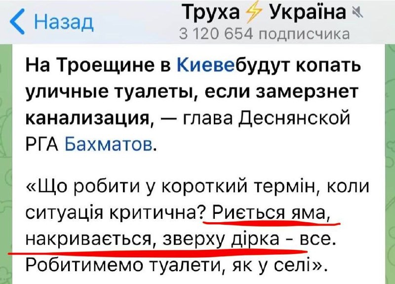 )😅 Но есть другая проблема, население Троещины — 300 000 человек Если они все будут ходить в уличные туалеты с дыркой в полу, Вы понимаете какая атисанитария будет в Киеве? 🔄 Ну шо х@хлы, а ведь буквально вчера вы смеялись над русскими и говорили, что у нас вместо унитазов выгребные ямы. Карма настигла?))😂 🌐 За Русский Мир©Резервный📣Наш Чат✔️Подпишись‼️
