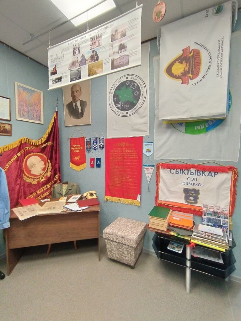 движения. Также представлено три инсталляции: палатка, фото с Владимиром Путиным и штаб ССО. Небольшой раздел экспозиции посвящен комсомолу. Часть материалов рассказывает не только об истории зарождения отрядов, но и о современных реалиях. Есть в музее и раритетные экспонаты: редкая фотография первого студотряда Ухтинского индустриального института, первый в России маркированный почтовый конверт, посвященный молодежному движению республики, форменные куртки студотрядо