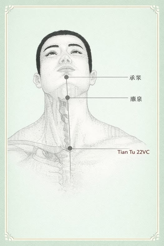*Регулирование и высвобождение* Цигун : “Танец Дыхания и Света” ( https://vk.com/topic-221293727_54476134 ) --- ### 🔸 Чэнцзян (VC-24) 📍 **Расположение: центр подбородка, углубление под нижней губой ✨ Ключевые функции: • Расслабляет челюсть и губы • Улучшает слюноотделение • Снимает напряжение лица • Поддерживает эмоциональное равновесие --- ### 🔸 Ляньцюань (VC-23) 📍 Расположение: середина шеи, над подъязычной костью ✨ Ключевые функции: • Облегчает глотание • Улучшает голос • Снимает боль и напряжение в горле • Освобождает жёсткость шейного отдела --- ### 🔸 Тяньту (VC-22) 📍 Расположение: центр основания шеи, углубление у яремной вырезки грудины ✨ Ключевые функции: • Раскрывает грудную клетку • Успокаивает кашель • Улучшает дыхание • Снижает тревожность и давление в груди --- ### 🖐 Рекомендуемая стимуляция • Мягкое, устойчивое давление • 20–30 секунд на точку • Глубокое, медленное дыхание • Работа сверху вниз --- ### 🌿 Глобальный энергетический эффект • Высвобо