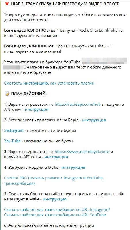 Главная проблема новичка в автоматизации - страх. Страх, что придется копаться в документации, настраивать какие-то «токены», ставить галочки в непонятных местах, а в итоге сценарий все равно выдаст ошибку И да, так часто и бывает, но в закрытом канале вы не остаетесь один на один со всем этим В закрытом канале этот вопрос я решаю пошаговыми инструкциями (пример на скринах 👆) и созданием своих модулей, чтобы уменьшить количество настроек Что еще стало доступно участникам: Вместо того чтобы вручную перепечатывать текст с видео или мучиться с настройками YouTube-транскрибации, вы получаете 3 готовых инструмента (модуля). В них уже зашита вся логика. Как это работает для вас: → Вы берете ссылку на любой короткий ролик (Instagram* Reels или YouTube Shorts) → Вставляете ее в специальное поле → Все, система сама делает остальную работу Что вы получаете на выходе автоматически: → Готовый текст видео - вам не нужно ничего слушать и печатать → Моментальный перевод - нашли крутую иде