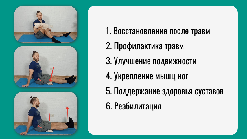 Простое упражнение для здоровья коленного сустава в домашних условиях. Варианты выполнения: Важные моменты: 1. Укрепление мышц ног - Квадрицепсы: Основная нагрузка приходится на четырехглавые мышцы бедра, что способствует их укреплению и развитию. - Икроножные мышцы: При выполнении упражнения также задействуются икроножные мышцы, что помогает улучшить их тонус и силу. 2. Улучшение подвижности коленных суставов - Регулярное выполнение упражнения способствует увеличению амплитуды движений в коленных суставах, что помогает предотвратить их скованность и улучшить общую подвижность. 3. Профилактика травм - Укрепление мышц вокруг коленных суставов снижает риск травм, таких как растяжения связок и повреждения менисков. 4. Улучшение осанки - Укрепление мышц ног и спины способствует поддержанию правильной осанки, что важно для здоровья позвоночника и общего самочувствия. 5. Повышение выносливости - Регулярные тренировки с этим упражнением помогают улучшить общую выносливость организма, что поле