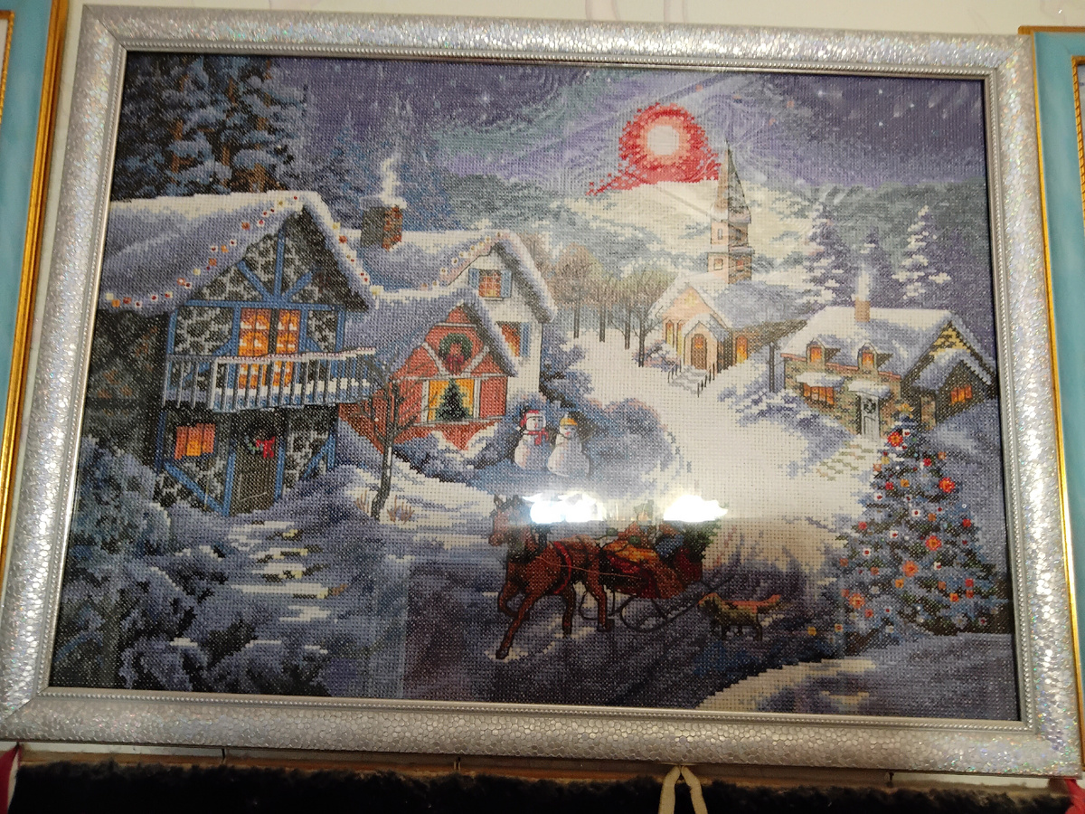 А мне нравятся именно большие, чтобы было видно всю работу целиком. Эту вышивку где-то Диана откопала. Я бы её назвала «Ночь перед Рождеством».