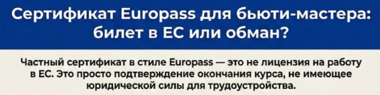 не заменяет признание квалификации. Это инструмент оформления информации, а не разрешительный документ. ❌ Неверно. Ни один регулятор в ЕС не выдаёт право на работу по Europass. Для бьюти-профессий в Европе (и особенно в Германии) действуют: Europass не отменяет: ❌ Тоже неверно. Europass: Он может сопровождать диплом,