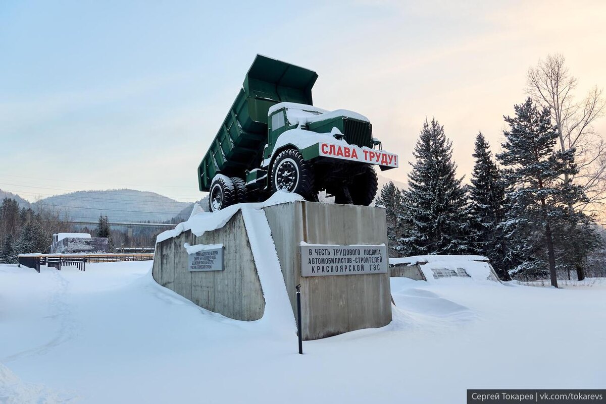 Монумент на выезде из Дивногорска перед Красноярской ГЭС. Центральный элемент - самосвал МАЗ-525 на четырехметровом постаменте. На таких машинах перекрывали русло Енисея. Грузоподъемность МАЗа 25 тонн, мощность — 300 л.с. Рядом бетонные пирамиды, которые закладывали в остов плотины Красноярской ГЭС. А за машиной стела с картинами строительства. Её, кстати, первый раз заменил. Всегда на машине проезжал мимо и все внимание забирал самосвал. Теперь хочу лета, чтобы посмотреть детальнее, что там вокруг. Видно, что есть какое-то благоустройство - из под снега торчат светящиеся столбики, перила. Приложил архивные фото, где как раз видно и МАЗы, и пирамидки. @tokarevs #поехалиВДивногорск