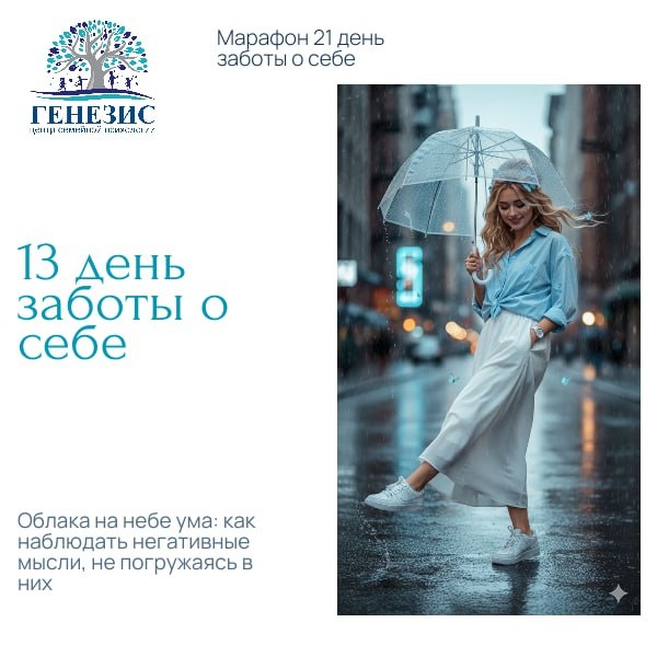 Добрый день, наши смелые наблюдатели внутреннего пространства! 🌤 Вчера мы учились возвращать внимание к тишине и дыханию. Сегодня мы применим этот навык наблюдения к тому, что чаще всего уносит нас из состояния покоя — к потоку мыслей, особенно негативных. Важно понять: вы — это не ваши мысли. Вы — это тот, кто эти мысли замечает. Мысли, особенно тревожные или критические, — это просто ментальная погода. Они приходят и уходят, как облака по небу. Проблема возникает, когда мы принимаем эти облака за всю реальность, начинаем с ними бороться или строить под ними дом. Сегодня поговорим о том, как стать метеорологом своего внутреннего неба. Не для того, чтобы всегда было солнечно, а чтобы не бояться дождя и знать, что за тучами всегда есть небо. Что такое негативная мысль с точки зрения заботы о себе? Это не «враг», а искаженный сигнал, часто пытающийся нас защитить («предупредить об опасности», «мотивировать через критику»). Наша задача — расшифровать сигнал, не поддаваясь панике. Пр