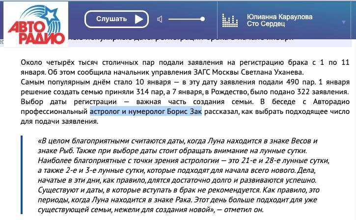 В эфире Авторадио я дал несколько рекомендаций по подбору благоприятной даты для бракосочетания. А если вы хотите подобрать дату для этого или другого события индивидуально под себя, то вы знаете, кому писать 👉 @BorisZak