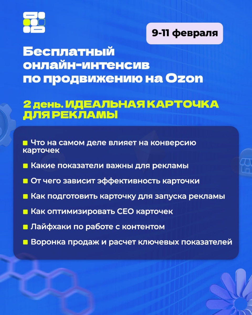 🔥 Во второй день бесплатного онлайн-интенсива по продвижению на Ozon разберём карточку товара. 🧐 Что реально влияет на конверсию, на какие цифры смотреть по рекламе, и почему «красивая» карточка часто не продаёт. Покажем, как готовить карточку к трафику и где обычно теряются деньги. 📅 9–11 февраля в 19 часов по МСК 🎓 Участие бесплатное 👉 Для участия вступите в канал по ссылке. Подробная информация и ссылки на эфиры будут там.