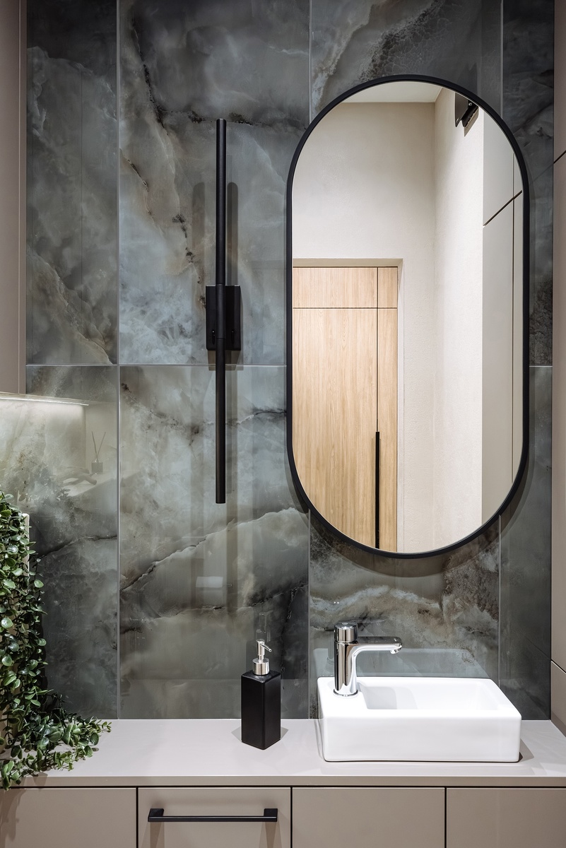 Один из долгосрочных трендов в дизайне ванных комнат – активное применение натуральных текстур. Как в этом может помочь керамическая плитка? Поймём на примере нескольких проектов, отмеченных призами Гран-при KERAMA MARAZZI. Тенденция последних нескольких лет – создание в домашних интерьерах выделенных зон, снижающих тревожность, способствующих естественному отдыху и расслаблению. Санузел, ванная комната или душевая для такой роли подходят как нельзя лучше. Каким бы ни был стиль интерьеров, ванную можно наполнить природной гармонией, благодаря правильно подобранным отделочным материалам, мебели и сантехнике. Здесь источники воды, приятные ароматы и деликатное освещение помогают создать пространство, быстро снимающее стресс и восполняющее запасы жизненной энергии. Проект «Каменный век» Дизайнер: Марина Раскидная (Петрозаводск) 3-е место Гран-при KERAMA MARAZZI 2024 в номинации «Жилые интерьеры» Весь проект выдержан в эстетике камня, от брутальных серых слэбов до романтичной глубины оник