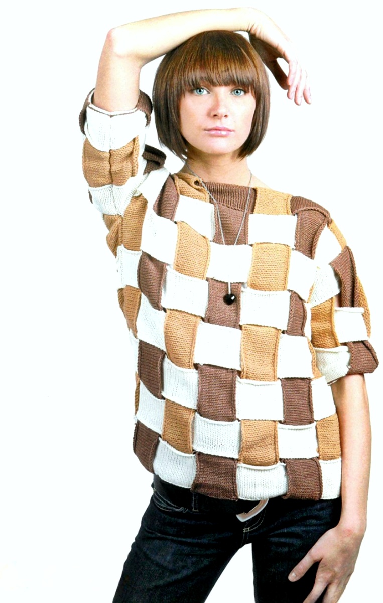 Все детали пуловера состоят из отдельно связанных и переплетенных вертикальных и горизонтальных полос.