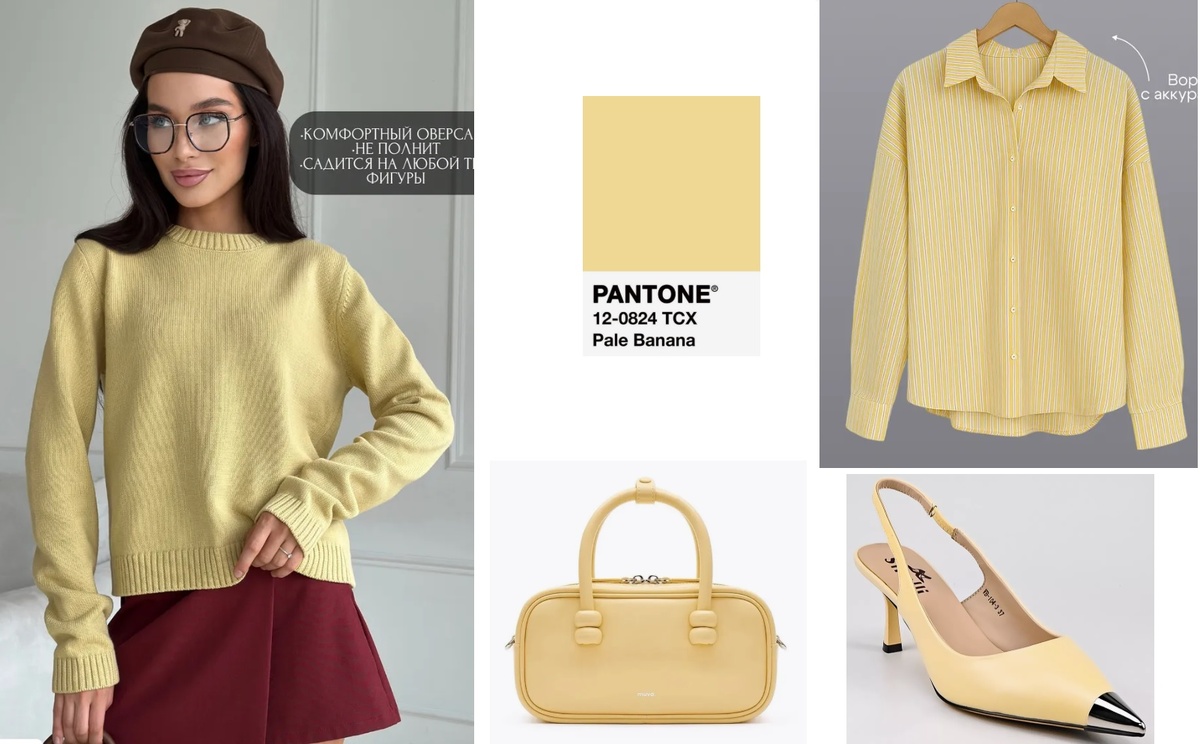 Весна все ближе, а я продолжаю помогать вам освежить гардероб к новому сезону. И для этого я сделала подборку удачных вещей с Wildberries в оставшихся не разобранными в прошлых статьях трендовых оттенках. Напоминаю, что при выборе новой вещи важно ориентироваться не только на модный цвет, но и на множество жругих нюансов: актуальность фасона, состав ткани, комплементарность вашей фигуре и колориту внешности. Первые два аспекта я учитываю при подборе вещей для таких статей и пишу какому цветотипу подходит тот или иной оттенок, чтобы дать вам максимум пользы. Pale banana. Интересное название- бледный банан. Часто у Pantone встречаются "съедобные" названия, но это прям забавное. А цвет классный- пастельный жёлтый, хорош доя летних вевушек, особенно для светлого лета. Джемпер 411802377. Хороший фасон- чуть свободный и не очень длинный- удобно подзаправить и навыпуск тоже неплохо. Состав ок- 100% хлопок, такой джемпер не только весной, но и летом иногда нужен. Рубашка 391432992. Рубашки в