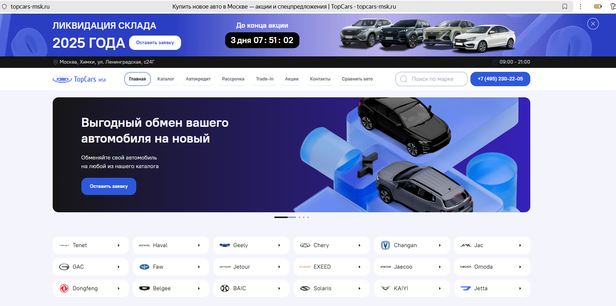 TopCars MSK — это автосалон в Москве. Занимается продажей новых китайских автомобилей. По своей сути является рекламным лендингом. Данные о реальном продавце скрыты. В автосалоне на Ленинградской с24Г в Химках можно купить новый автомобиль. В каталоге представлено более 20 марок. Автосалон специализируется на продаже китайского автопрома. Смущает то, что дилер без официального статуса обещает скидку около 50%, что уже кажется нереалистичным. Ощущение, что покупателя заведомо вводят в заблуждение, подтверждается и тем, что обещания скидок не закрепляются документально. К тому же по указанному адресу находится другой салон — Мас Моторс. А перед нами — рекламный лендинг. Связываться с дилером, который скрывает свое реальное название — заведомо высокорисковое мероприятие. Владельцем автоцентра TopCars MSK является ООО "ГЕФЕСТ АВТО" (ИНН: 5040134183). На сайте Мас Моторс указан другой владелец, поэтому мы не можем связать эти салоны напрямую. Следовательно, невозможно достоверно сказат