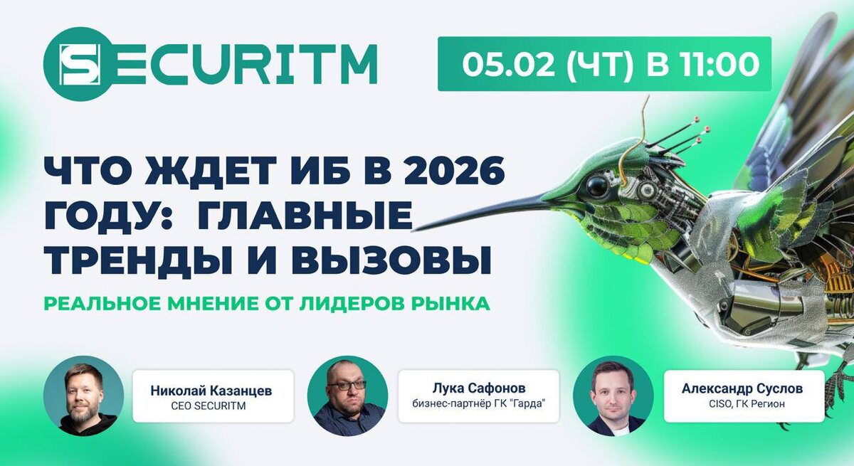 🔵🔵🔵🔵🔵 Что ждет Службы ИБ в 2026 году. Главные тренды и вызовы 🗓 5 февраля в 11:00 В 2025 году атаки участились, регуляторы ужесточились, и многие службы до сих пор тонут в рутине — сборе доказательств, отчетах, контроле уязвимостей — и не успевают анализировать реальные угрозы. Приглашаем на вебинар с практиками и экспертами отрасли. Разберём не только тренды, но и конкретные шаги для адаптации вашей ИБ-стратегии. Приглашенные гости: 🎼 Николай Казанцев, CEO SECURITM 🎼 Лука Сафонов, бизнес-партнёр ГК "Гарда" 🎼 Александр Суслов, CISO ГК "Регион" На вебинаре ответим на ключевые вопросы: 🔵Итоги 2025: главные уроки для ИБ-специалистов. Что устарело, а что стало критически важным? 🔵Тренды 2026: куда движется рынок? Почему SOC, Managed Security и SGRC растут быстрее рынка и как это использовать? 🔵Импортозамещение vs. Безопасность: как выбирать и тестировать российские решения без потери в защищённости? 🔵Финансы и аргументы: как обосновать инвестиции в ИБ руководству? На каки