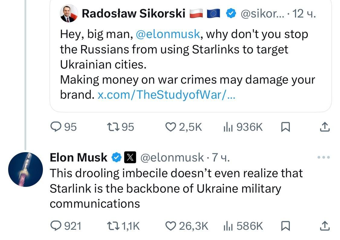 Ранее Радослав Сикорский просил американского бизнесмена отключить Starlink на территории Украины для того чтобы помешать России наводить беспилотники. Маск ответил "Этот пускающий слюни имбецил даже не понимает, что Starlink является основой военной связи Украины".