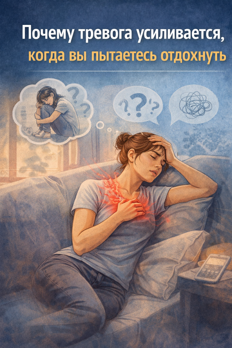 «Со мной что-то не так?» На самом деле это очень распространённое состояние — и у него есть объяснение. Чаще всего тревогу представляют как: Но существует и другая форма — фоновая, хроническая тревога, которая может годами жить в теле и психике. Она проявляется не криком, а: И именно такая тревога часто усиливается во время отдыха. Когда человек долго живёт в режиме ответственности, контроля и напряжения, его нервная система привыкает быть в постоянной готовности. Дела, движение, занятость — становятся способом справляться с тревогой.