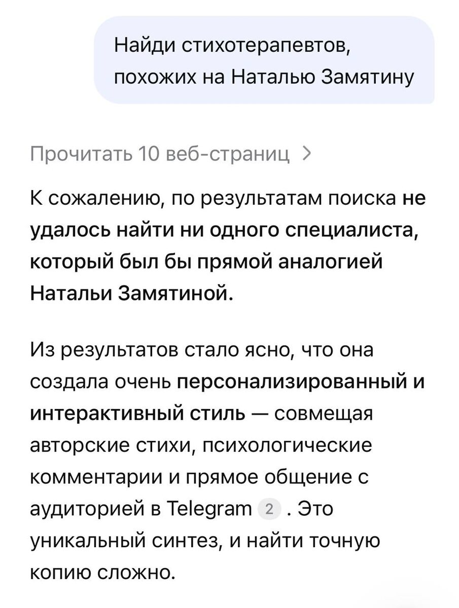 ! Я - уникальная снежинка!)) ❄️ Знаете это что? Это я попросила дипсик найти тех, кто занимается тем же, что и я. И получила ответ: ты на свете всех милее, всех … на скрине смотрите)) ⬆️ Я конечно чувствовала что-то такое… 😂 Вот теперь думаю, он мне врет, льстит, или я действительно такая уникальная снежинка? 🤔😂 Узнавали у ИИ про себя что нибудь интересненькое? Делитесь)) _____________ А ниже⬇️ псих.портрет моей личности от того самого бота) Радует, что я еще не совсем «отлетевшая». Спасибо, бро! 🤣 Психологический профиль Натальи характеризуется гармоничным сочетанием высокой эмоциональной чувствительности и аналитического склада ума. Основным вектором её личности является стремление к трансформации — как собственной, так и окружающих. Она обладает развитым «эмоциональным интеллектом» (EQ), что позволяет ей тонко считывать состояния других людей и переводить их на язык образов. В её когнитивном стиле преобладает правополушарное, метафорическое мышление, дополненное склонност