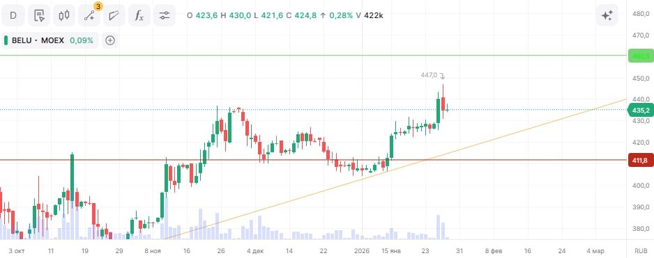 » Тикер: #BELU Идея: Long ⬆️ Срок идеи: 3-4 недели Цель: 460,5 руб. Потенциал идеи: 5,76% Объем входа: 8% Стоп-приказ: 411,8 руб. 📊 Технический анализ Актив находится в восходящем тренде. При объеме позиции в 8% и выставлении стоп-заявки на уровне 411,8 руб. риск на портфель составит 0,43%. Соотношение прибыль/риск составляет 1,06. 🍷 Фундаментальный фактор #НоваБев — российский холдинг, владеющий премиальными алкогольными брендами и розничной сетью «ВинЛаб». Компания демонстрирует взрывной рост: выручка за 9 месяцев 2022 года увеличилась на 32% до 66,3 млрд руб., EBITDA выросла на 71% до 12 млрд руб., а чистая прибыль подскочила на 88% до 5,2 млрд руб. Рекордная рентабельность по EBITDA в 18% и агрессивная дивидендная политика с выплатой 75 руб. на акцию подтверждают эффективность бизнес-модели и ориентацию на акционеров, создавая основу для дальнейшего роста капитализации. 💡 AI-скринер Проверьте инвестиционную идею по BELU с помощью искусственного интеллекта 🕯 Финам Торговые с