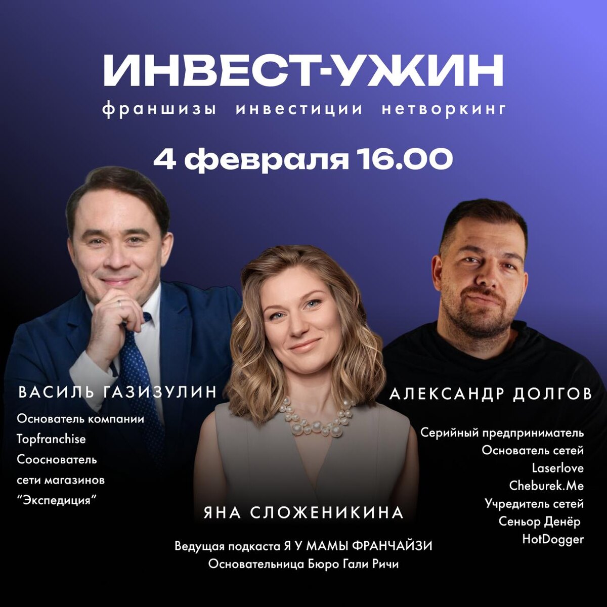 ? Инвест-ужин Бизнес Факта для предпринимателей, инвесторов и владельцев капитала. Программа вечера: — выступления спикеров с практическими кейсами — батл франшиз: разбор моделей, вопросы и обсуждение — батл питчей: проекты, инвестиционные гипотезы, обратная связь Кстати Яна будет модерировать батл франшиз. Если вы хотите принять участие в батле и представить свой проект, напишите напрямую @Iana_Slozhenikina Ждём инвесторов, собственников и команды франшиз, проекты, ищущие инвестиции, предпринимателей, планирующих продажу готового бизнеса. 📍 Встречаемся 4 февраля в Москве 16:00–22:00. 👉 Для участия необходима регистрация 👉 Количество мест ограничено По всем вопросам @biznes_fakt_msk