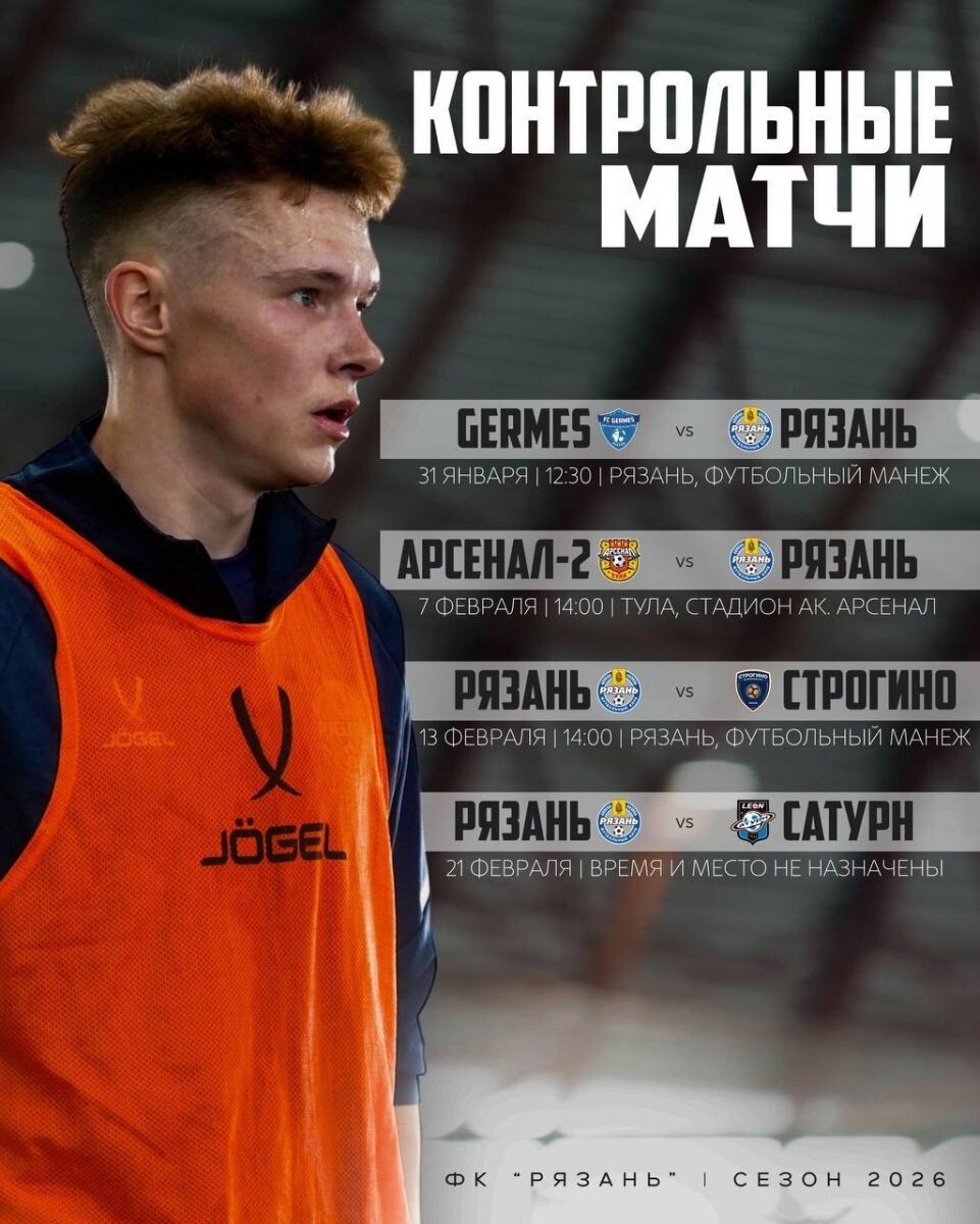 Футбольный клуб «Рязань» в период подготовки к предстоящему сезону проведет серию контрольных матчей. Первая встреча состоится 31 января в 12:30 на домашней арене – в футбольном манеже города Рязани. Соперником выступит команда «Гермес». Далее, 7 февраля в 14:00, клуб сыграет против «Арсенала-2» в Туле на стадионе академии «Арсенал». Следующий матч пройдет 13 февраля в 14:00 снова в Рязани, где ФК «Рязань» примет команду «Строгино». Заключительная игра запланирована на 21 февраля против клуба «Сатурн». Точное время и место проведения данного матча будут определены и объявлены дополнительно. 0+