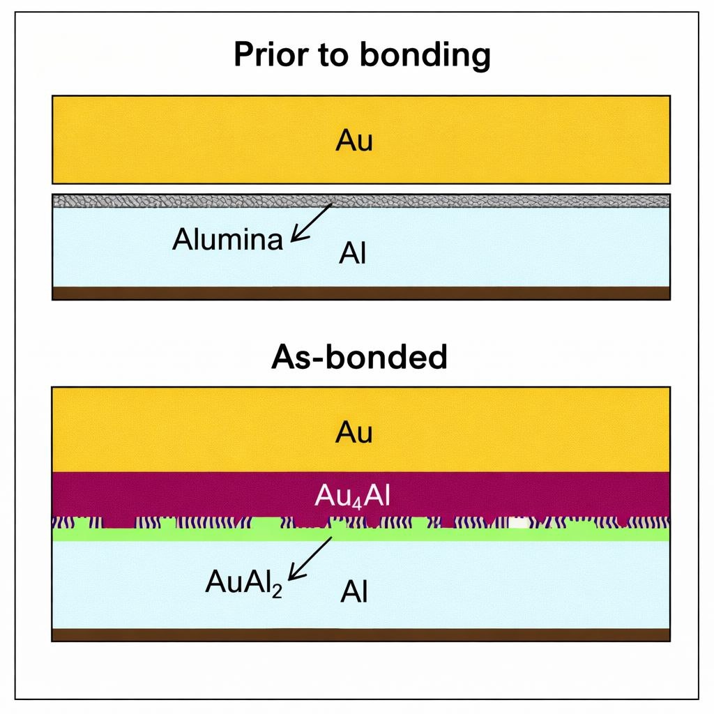 При этом сама «purple plague» — не миф, а реальная и хорошо задокументированная проблема микроэлектроники 60–70-х годов. Физика процесса проста, а последствия жёсткие. На алюминиевых контактных площадках кристалла и золотых выводах корпуса при длительном нагреве (разварка, термостресс в эксплуатации) начинается активная взаимная диффузия. Образуются интерметаллические соединения системы Au–Al, самый проблемный из которых — AuAl₂. Он имеет характерный фиолетовый оттенок и крайне низкую механическую прочность: контакт деградирует, растрескивается и может разрушиться от вибраций или термоциклировани