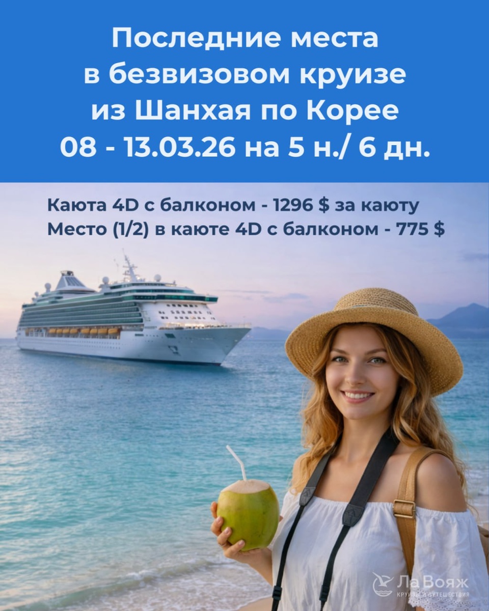1296$/ каюта! Есть место 1/2 в каюте с балконом (подселение)! В продаже - последние каюты с балконом на безвизовом круизе из Шанхая по Корее по суперценам: 📍 Даты: 08 – 13.03.26 на 5 н./ 6 дн. Лайнер: Spectrum of the Seas 5* Маршрут: Шанхай, Китай - Пусан, Южная Корея - Согвипхо (о.Чеджу), Южная Корея - Шанхай Стоимость: 🔸 каюта 4D с балконом - 1296$ (103 435 руб)/каюту на 2-х по тарифу “Суперцена с невозвратным депозитом” 🔸 ½ (место) в каюте для женщины - 775$ (61 854 руб)/чел по тарифу “½ DBL в каюте с подселением” ✴️ Преимущества круиза: - полностью безвизовый круиз - выгодные цены на последние каюты с балконом - есть удобные прямые перелеты из РФ в Шанхай - экскурсии на русском языке в портах захода 🛳 Лайнер Spectrum of the Seas 5* – это настоящий «плавучий отель» 5* и даже круче: - Питание «все включено, без алкогольных напитков» - Многочисленные бары, кафе, рестораны - Красочные шоу в бродвейском стиле и развлекательные программы - Инновационная инфраструктура для отдых