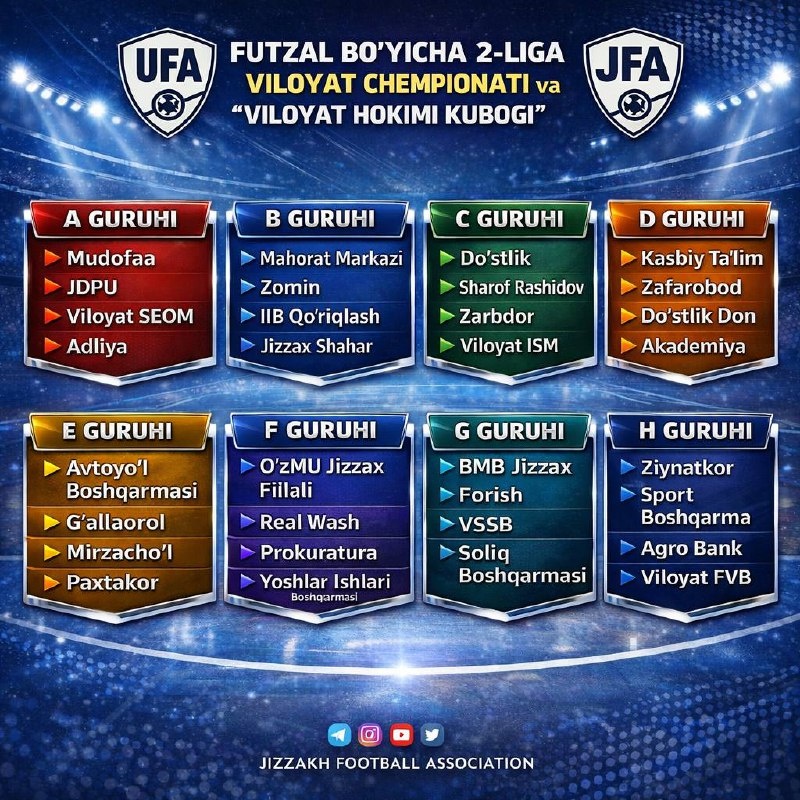 Футзал бўйича 2-лига вилоят чемпионати ва “Вилоят Ҳокими Кубоги” мусобақасининг 2-босқич йўлланмасини қўлга киритган жамоалар номи маълум бўлди Кейинги босқичга йўл олган 32 та жамоанинг гуруҳлари ҳам аниқ. Шу кунларда жамоалар таркибини кучайтириш мақсадида трансфер ойнаси очилган. Жараён 31 январга қадар давом этади. Каналимизга обуна бўлинг ва энг сўнгги янгиликларни кузатиб боринг Jizzaxnews |Тelegram | Facebook | Dzen | YouTubе