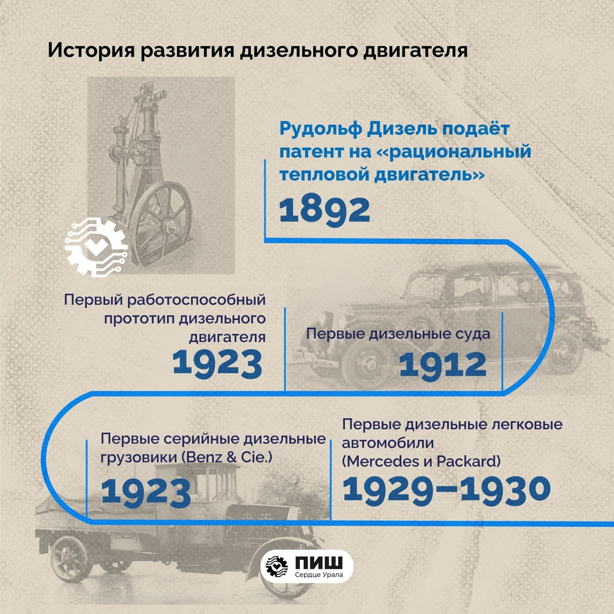 🎉 Сегодня отмечаем день рождения дизельного двигателя — 129 лет назад, в 1897 году, Рудольф Дизель впервые продемонстрировал работоспособный двигатель с самовоспламенением топлива от сжатия, достигший КПД около 26%. 🔎 История началась с патента 1892 года и создания первого рабочего образца. Затем последовали ключевые этапы: первые дизельные суда (1912), первый серийный грузовик (1923), первый серийный легковой дизель Mercedes-Benz 260D (1936) и промышленный запуск системы Common Rail (1997), радикально улучшившей эффективность и экологичность. Сегодня дизели обеспечивают до 80% грузовых перевозок и доминируют в морском транспорте, будучи на 20–35% экономичнее бензиновых аналогов с КПД до 50%. 👨🏻🎓 В Передовой инженерной школе «Сердце Урала» реализуются образовательные программы по разработке двигателей: бакалавриат «Перспективные двигатели» и магистратура «Двигатели для устойчивого развития», готовящие специалистов для будущего этой технологии. #ПИШ #ПИШСердцеУрала