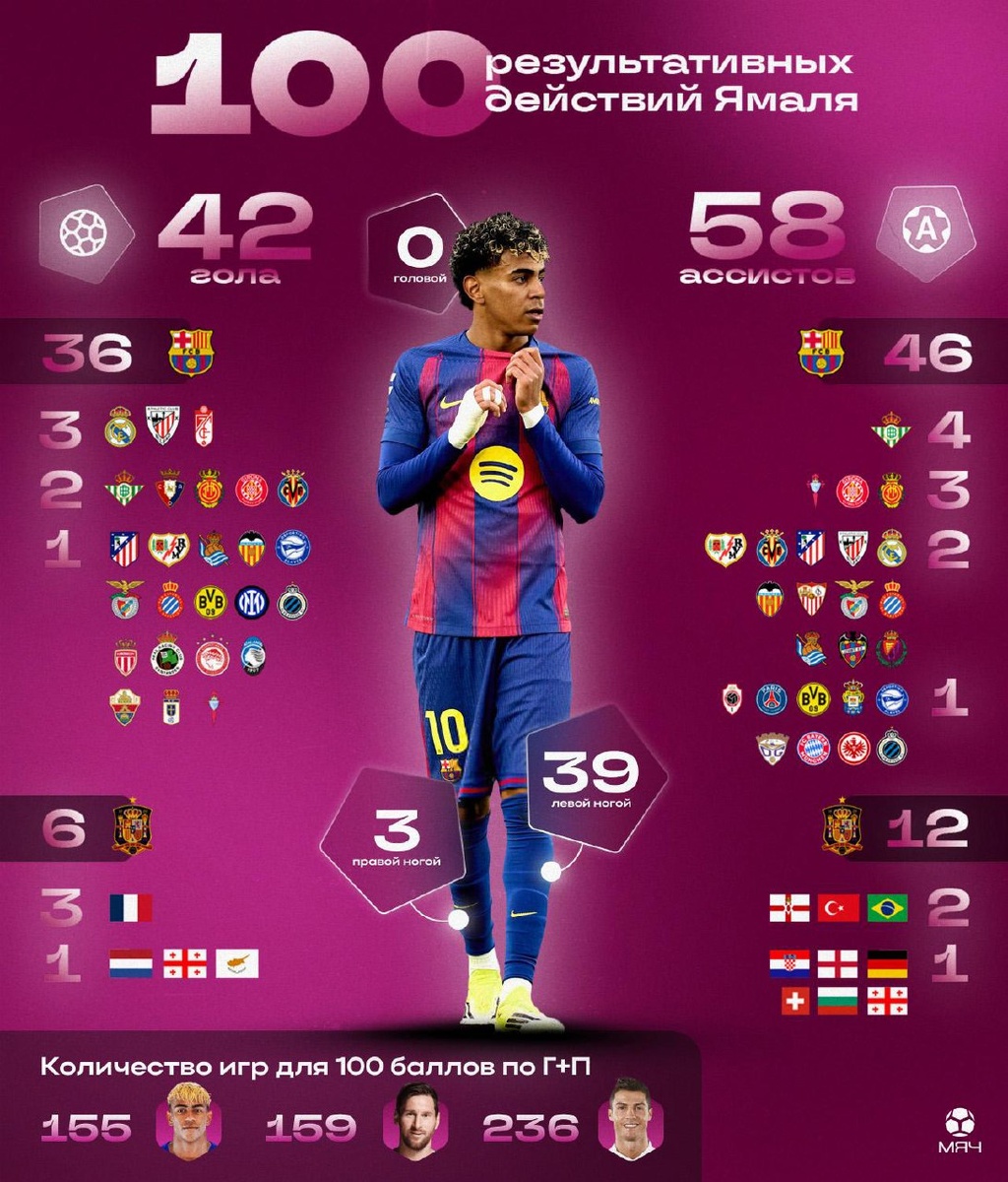 Кому и как он забивал? Сотня результативных очков испанца распределилась в соотношении 58 на 42 в пользу ассистов. Среди клубов больше других от Ламина досталось «Бетису» – 2 гола и 6 передач, но юный вингер каталонцев любит огорчать и топов с предтопами. По количеству голов любимыми командами на клубном уровне являются «Реал» и «Атлетик» (+ «Гранада»), а на уровне сборных – Франция. Кстати, Ямаль оформил 100 по Г+П быстрее Лео Месси (совсем не значительно) и Криштиану Роналду – управился за 155 матчей. @myach