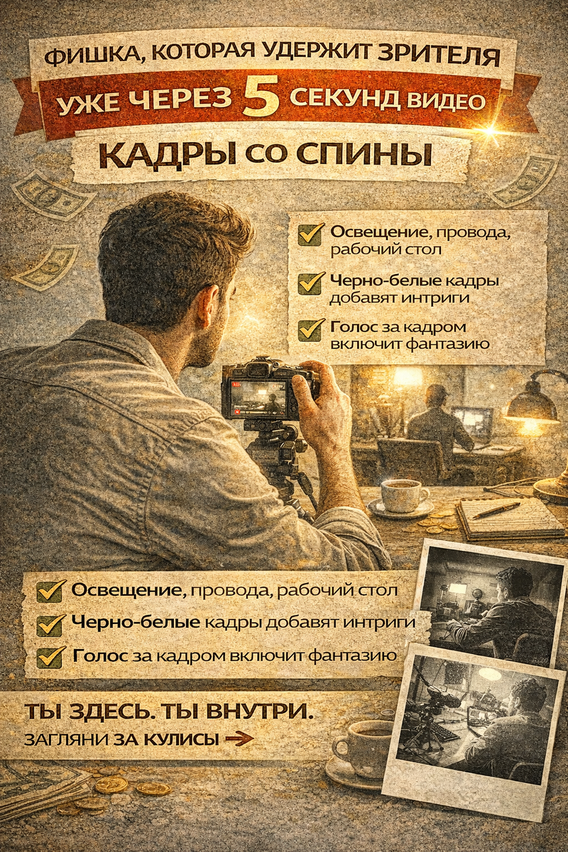И нет — это не про «кричащий заголовок», не про прыжок в кадр и не про фразу «досмотрите до конца». Есть более тонкая, психологически сильная фишка. Это...тадааам - Кадры со спины. Да-да. Самые недооценённые, но невероятно цепляющие кадры. Человеческий мозг обожает подглядывать. Ну природа у нас такая и с ней фиг поспоришь)