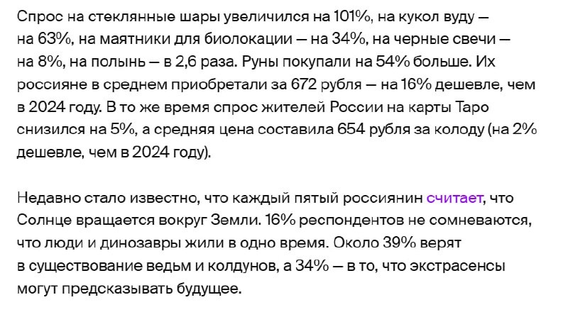Вот появилась статистика по 2025г. и по продаже так скажем, интересных товаров. В статье также говорится о том, что вырос спрос на обереги и осиновые колья Напомню, что на сегодняшний день никаких запретов деятельности тарологов, астрологов, хиромантов, нумерологов и колдунов нет. Деятельность никак не регламентирована, и фактически ОКВЭД отсутствует( можно попробовать 96.09 Предоставление прочих персональных услуг, не включенных в другие группировки), не входит в перечень реестр профессий, утвержденных на территории РФ, и следовательно, не подлежит лицензированию. Но занимаясь такой деятельностью имейте в виду,что очень формально она подпадает под статью 159 УК РФ На территории Российской Федерации уже имеется судебная практика привлечения за мошенничество (ст. 159 УК РФ) человека, оказывающего услуги по снятию порчи (определение ВС РФ дело № 77-19/2025, определение 4 КСОЮ от 23.01.2025г. дело № 77-19/2025) ссылка на статью,и дела в комментариях.