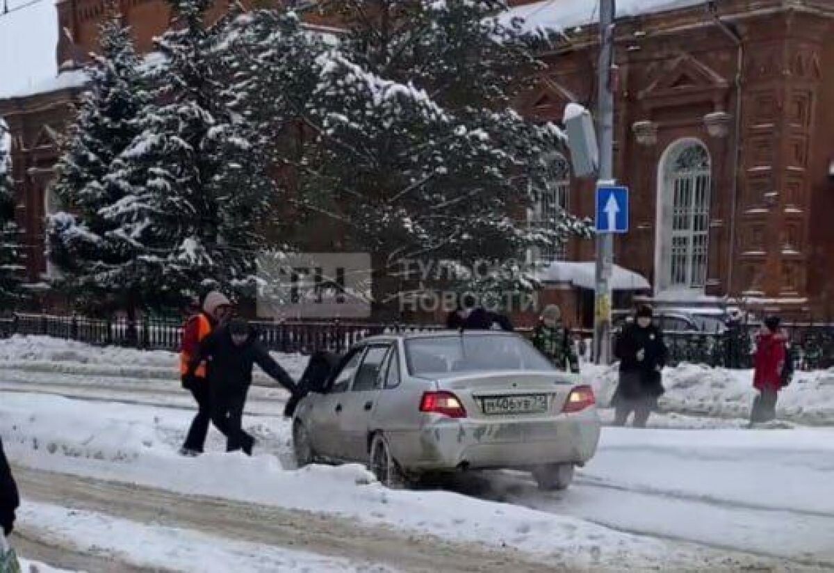 В Туле школьники помогли водителю вытолкать автомобиль из сугроба на трамвайных путях