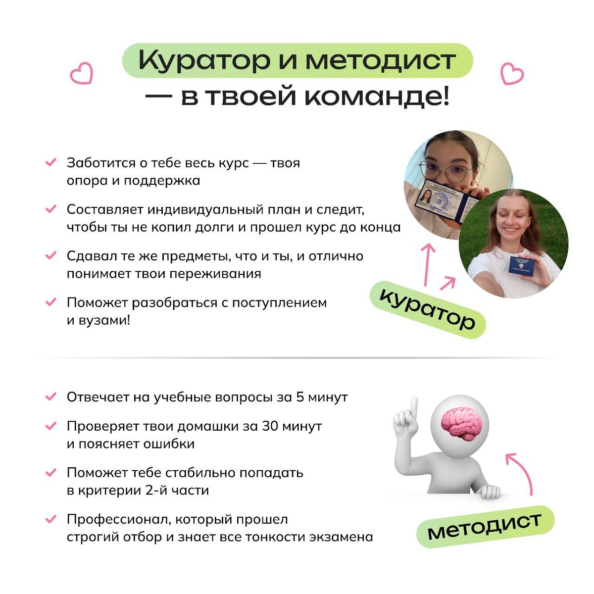 ? Дело не только в домашках или вебах, а в нашей команде — методистах и кураторах. С ними самый сложный год школы станет для вас сильно легче, ведь вы будете всегда окружены поддержкой ❤️ Объясняю, кто есть кто: ⭐️ Методист — это человек, который проверяет твои домашки и занимается предметными вопросами Все наши методисты сдали биологию на 90 (а чаще даже на 95) и выше, в их знаниях можешь не сомневаться. Методисты оценивают твою вторую часть по всем критериям, детально объясняют ошибки и присылают проверку в среднем за 30 минут Почему так быстро? Потому что домашки проверяются по биржевой системе. Как только ты сдаёшь ДЗ, оно улетает свободному методисту. В итоге проверку ты получаешь, пока ещё помнишь задания 😍 В чате с методистом всё работает так же. Ты можешь задать любой вопрос по биологии и получишь ответ всего за 5 минут! п.с. Даже если сдать домашку после дедлайна, её всё равно проверят за полчаса 🚫 ⭐️ Куратор ведёт тебя по курсу, помогает выбрать цели, наладить распи