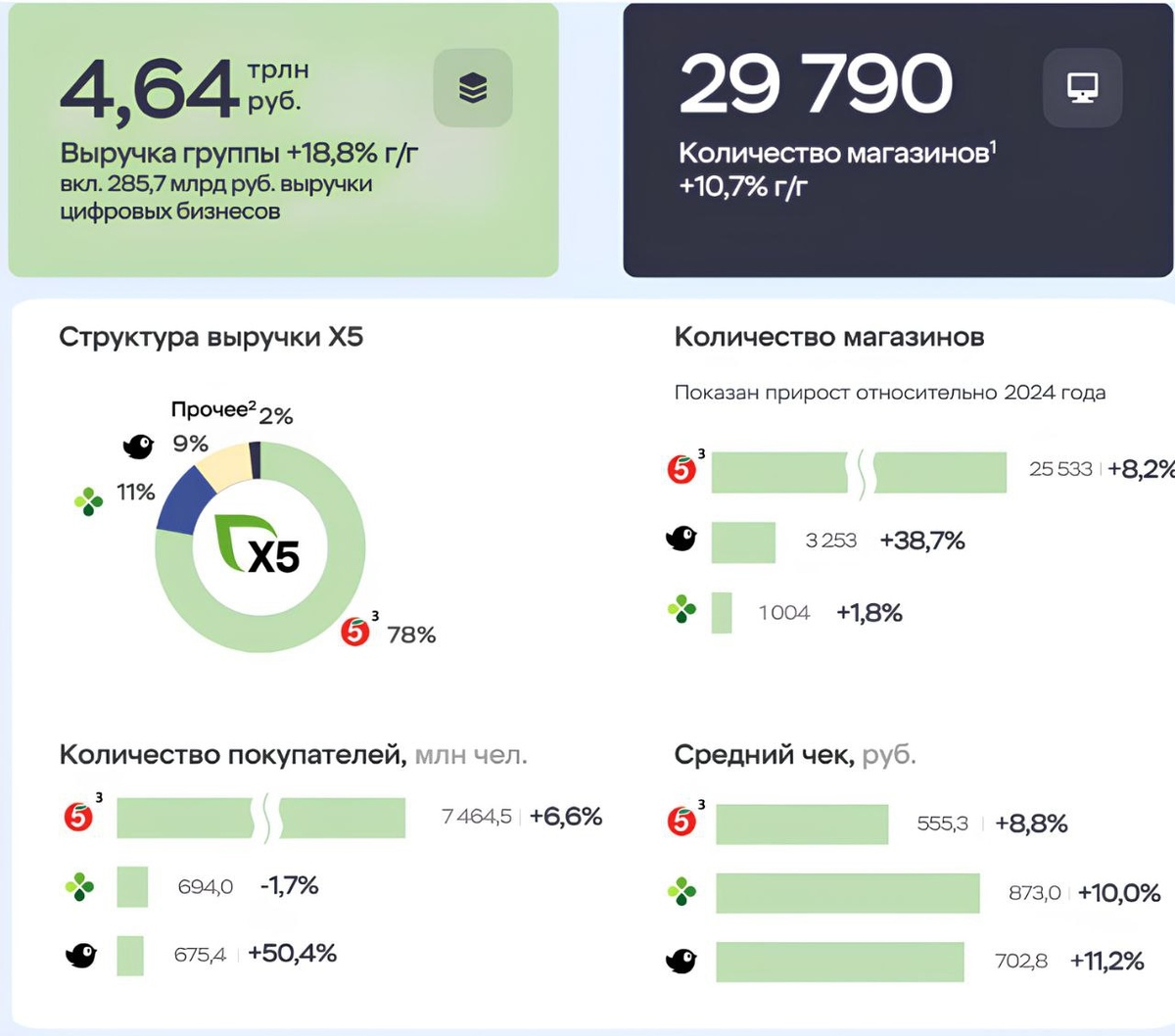 % Чистая выручка достигла 4,64 трлн рублей (те самые +18,8% год к году). "Пятёрочка" - работает на всю компанию - выручка выросла на 16%, до 3,61 трлн рублей. Но если "Пятёрочка" - это стабильная база, то "Чижик" - это ракета, выручка которого взлетела в космос - на 67,3% (до 417,5 млрд рублей). "Перекресток" показал аккуратные +8,2% (531,1 млрд руб.). Кстати, о масштабах. К концу года у всей группы насчитали 29 700 торговых точек, и это +40% за год. LFL-продажи выросли на 11,4%, причём не только за счет чека, но и за счет трафика. А цифровой бизнес прибавил 42,8% - такие сервисы принесли группе 285,7 млрд рублей. Так что Х5 уверенно заходит в 2026-й. #X5Group #Retail #ритейл #продукты #FMCG #Пятерочка #Перекресток 👍 Знание — сила! Подписка — кнопка!