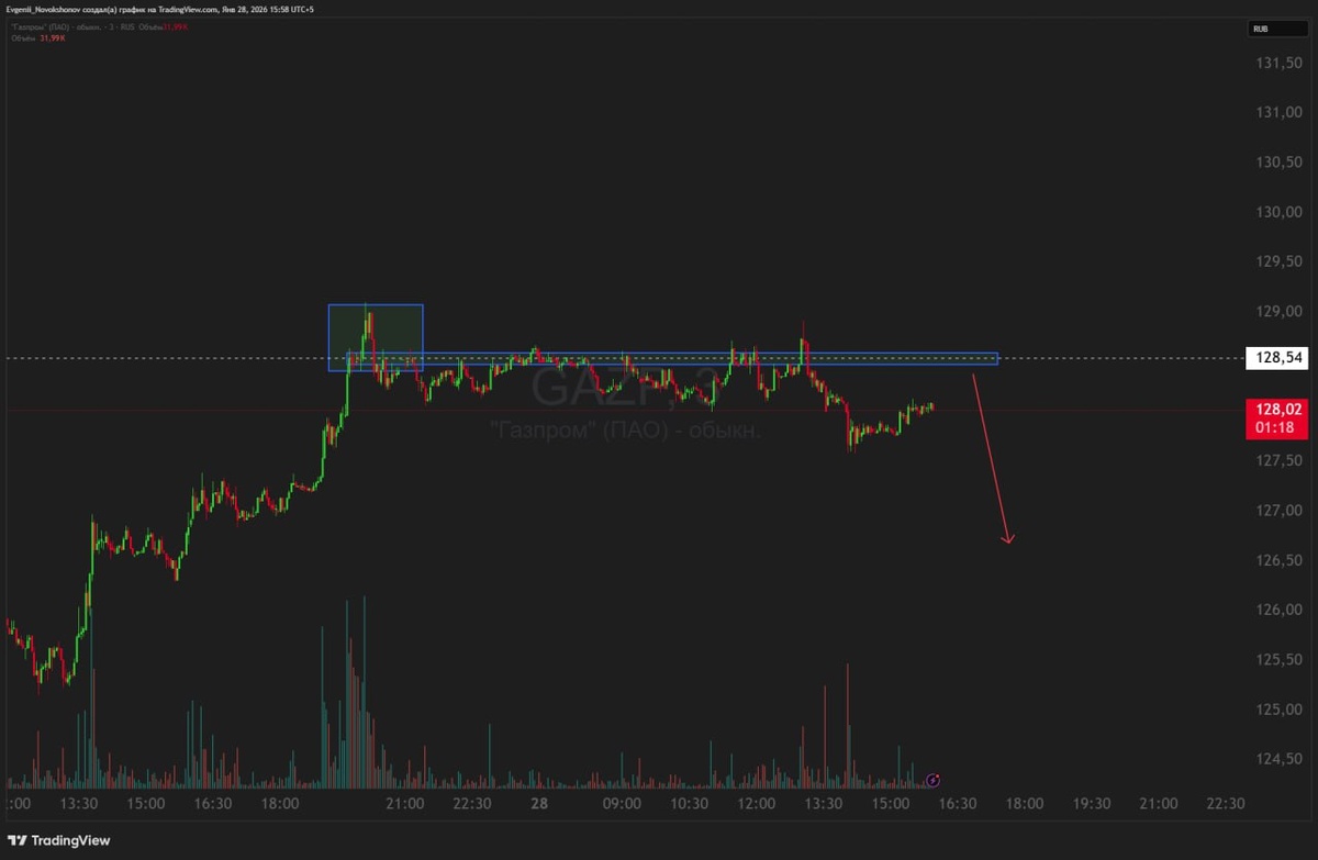 Имеется потенциально неплохая точка входа в шорт. от уровня 128,54