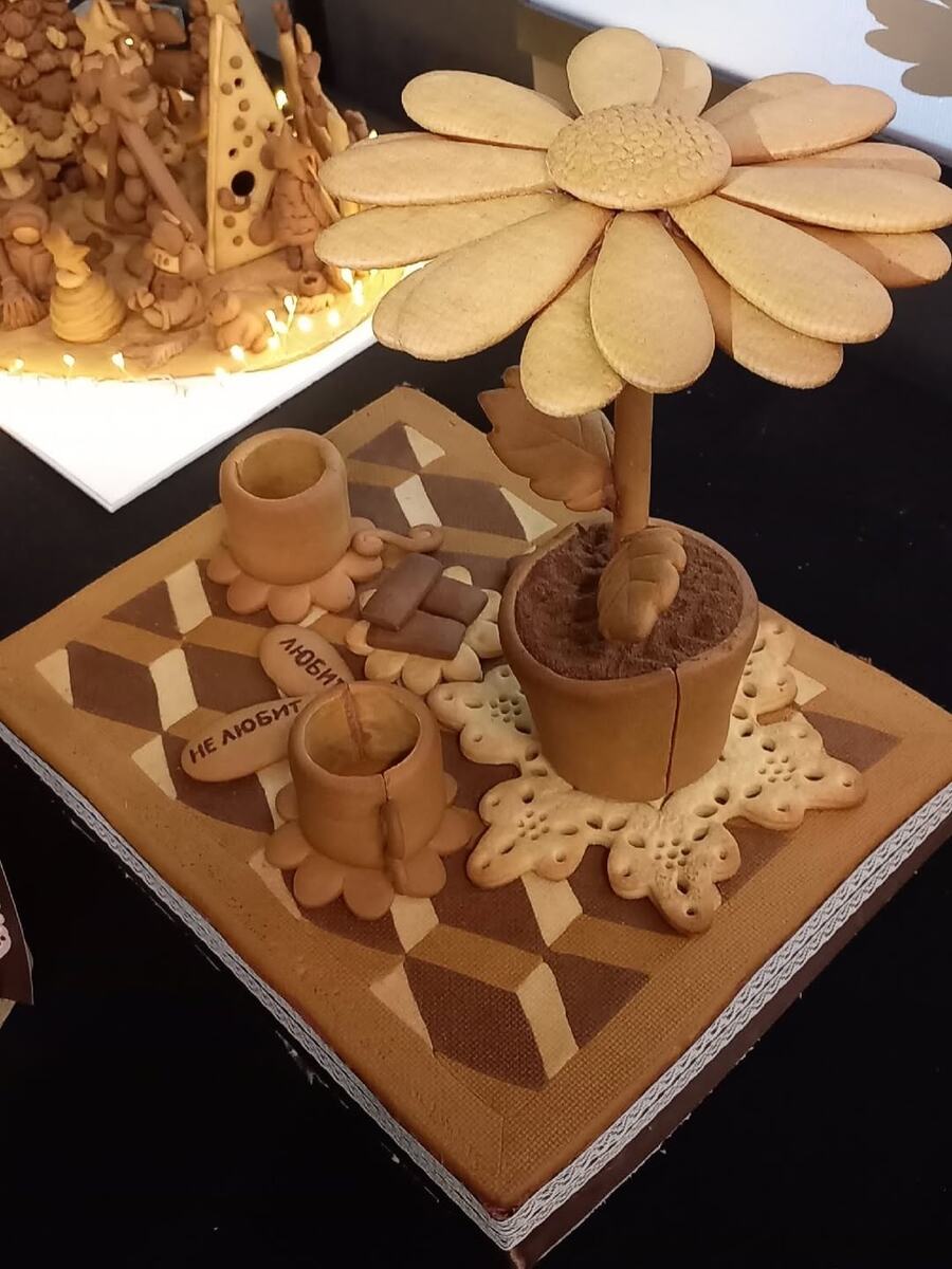 И в 2025 году она заняла 2 место в категории «Профи» в сложной номинации «Пряничная композиция без декорирования глазурью» с работой «Любит - не любит». Идея родилась из желания создать историю: женщина гадает на ромашке. Особенно жюри отметили аккуратный коврик из разных видов теста и сложный столик из трёх оттенков.