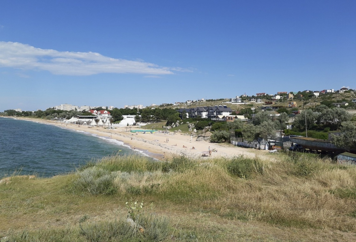 Если идти дальше, то начинается участок западнее. Тут берег уже меняется, песок становится грубее, появляется галька. Пляж Тёплая балка я нашла случайно, никто мне про него не говорил. Там действительно тихо, просто склон, потом немного кустов, потом песок и вода. Я там посидела минут 20, никого не было, только чайки. За пляжем стоит геодезическая вышка. Очень высокая, я даже залезла на первую секцию посмотреть. Видно весь залив, очень удобно для фото.