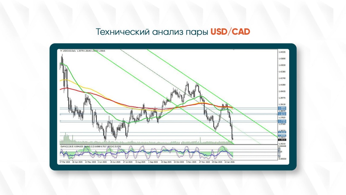 Пара USD/CAD подошла к критической технической зоне, где любое движение может задать вектор на недели вперёд. Рынок зажат между ключевыми уровнями поддержки и сопротивления, а судьба дальнейшего тренда во многом будет решаться не графиками, а итогами заседаний ФРС США и Банка Канады. Разбираем техническую картину, ключевые уровни и торговые сценарии от экспертов Vantage Markets. USD/CAD остаётся в фазе консолидации у важных технических уровней. Рынок ждёт импульса, который определит, сохранится ли глобальный бычий контекст или начнётся более глубокая коррекция. Подобные зоны часто становятся отправной точкой для сильных движений. Сигналом для развития нисходящего сценария станет пробой минимума 1.3560. В этом случае давление на пару может усилиться, особенно на фоне возможной слабости доллара США. При дальнейшем снижении цена может направиться к стратегическим уровням: Эта область отделяет бычий рынок от медвежьего. Пробой зоны 1.3600 и максимума 1.3615 станет сигналом для развития кор