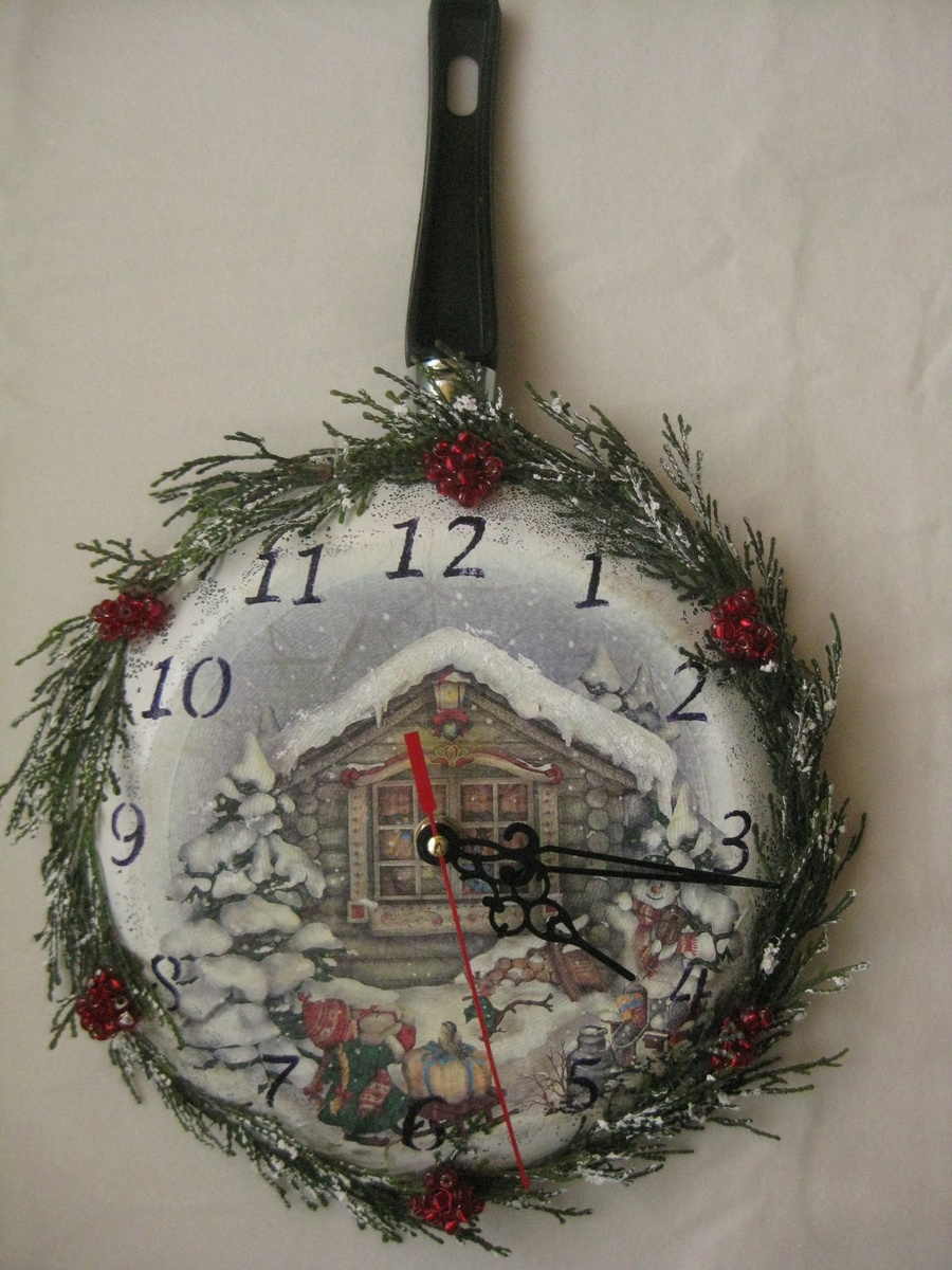 Не знаю, у кого как, а у меня, как только закончились новогодние праздник, и все, что о них напоминает стало каким-то неуместным. Вот, правда, как только я убираю елку, сразу ужасно хочется весны. И, тем не менее, сама уборка тоже доставляет мне радость. Во-первых, как я уже говорила, уборка новогодней атрибутики, это уже как бы процесс заговора на весну. Ну, а во вторых, пока складываешь в коробки новогодние вещички, опять окунаешься в воспоминания: как к тебе попала вещичка, кто и как ее подарил, как делал, почему делал и т.д. Вот часики новогодние, заиндевелые, замороженные. Остались с того благословенного периода, когда я училась декупажировать. Я хорошо помню все свои эмоции, когда я только познакомилась с этой техникой. Сколько часов я провела за компьютером, любуясь работами мастериц. Как внимательно изучала он-лайн мастер-классы. Как на "трех оленях" добиралась до очных встреч. Мне казалось, что овладев декупажем, я сделаю из своего деревянного дачного дома - сказочный те