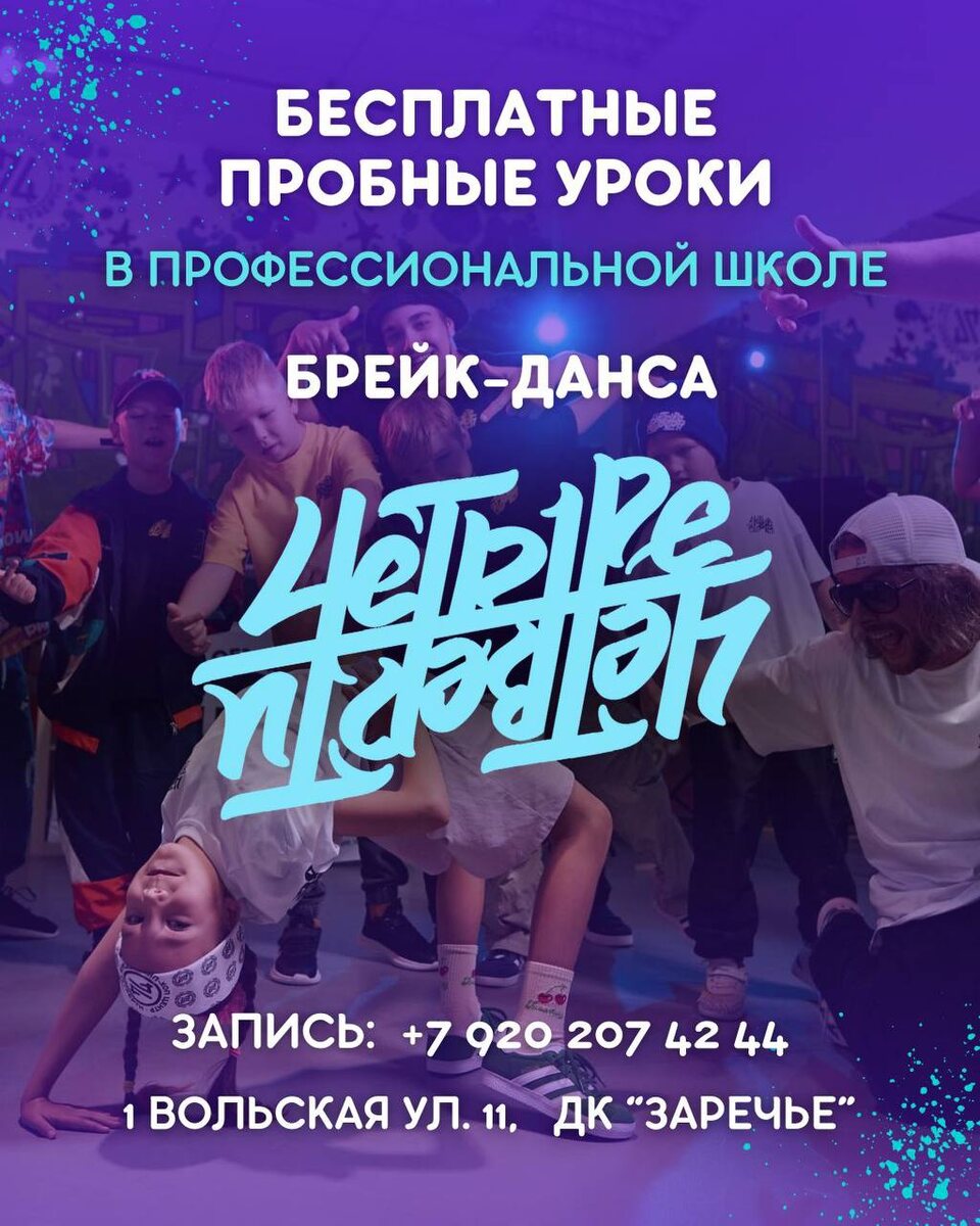 брейк-данса «четыре четверти» приглашает новичков (7-14 лет) на бесплатный пробный урок 2 февраля в 20.00 В филиале по адресу: 1-ая Вольская ул, 11 ДК «Заречье» (Некрасовка) ____________ Участники: - узнают как проходят занятия и познакомятся с преподавателем - научатся танцевать первые движения - получат массу полезной информации и хорошего настроения! 📲ЗАПИСЬ на урок обязательна - в сообщения @hhcenter44 - или по тел +79202074244 В «четыре/четверти» опытные педагоги ведут учеников к результатам в дружеской и комфортной атмосфере. Помимо тренировок ученики участвуют в концертах, батлах, сборах, интенсивах, чемпионатах и спектаклях! Набор новичков в группы открыт! Записывайтесь, приходите, получайте пользу от «четыре / четверти»! 🌐сайт https://chetire-chetverti.ru/ ИП Дробот И.Н. ИНН 312772500197
