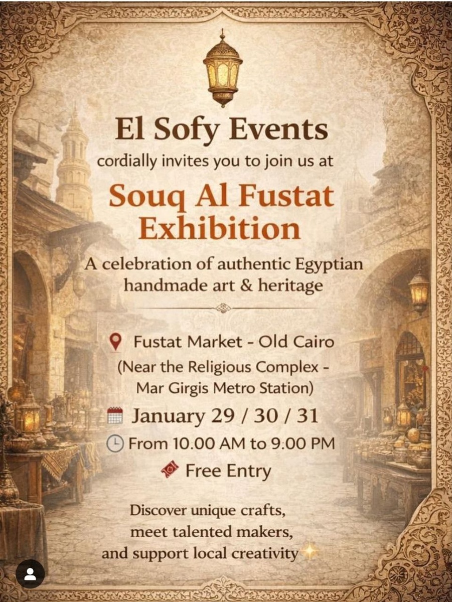 29 - 31 января откроется рынок египетского искусства и подлинных народных промыслов. 📍https://maps.app.goo.gl/c2BUgEpCzejPdLNm6 Место: Рынок Фустата — Старый Каир (рядом с комплексом «Религиозная община» / ближайшая станция метро «Мар Гиргис») Вход свободный.