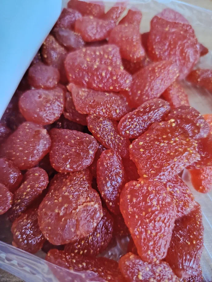 Знакомьтесь, это наша новая вкусняшечка! И виновница торжества прибыла ко мне не с рынка, а прямиком из цифровых недр маркетплейса. Я просто скролила ленту в поисках полезных перекусов, и меня подстрелили яркой картинкой с надписью «100% клубника. Без сахара». «Ну-ну, - подумала я, - очередная уловка». Но палец уже тыкнул «купить». Когда посылка прибыла, я ожидала увидеть горсть сморщенных, кислых кусочков. Но что же выпало из пакета? Настоящие клубничные хамелеоны! Они не высушенные, а словно уплотненные. Цельные, мягкие ягодки цвета летнего заката. Они пахли… да они пахли настоящей клубникой! Не вареньем, не конфетой, а полем, солнцем и июнем. И вот первый кусочек отправляется в рот. И наступает момент истины и сладкого обмана. Надпись «без сахара» - не вранье. Потому что сахар тут и не нужен! Эта ягода - самодостаточный сладкоежка. Она безумно сладкая, прямо по-клубничному. Концентрированный вкус лета, который тает во рту. Жуешь эту мягкую, жевательную текстуру и не веришь, что это