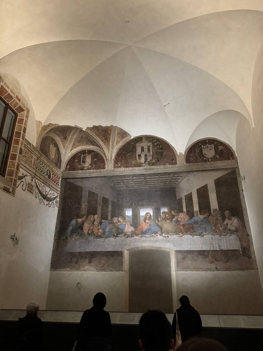 ! Очень круто, вдохновляет проделанная работа. Леонардо отверг традиционную фреску на сырой штукатурке, которая требует быстрой работы, и выбрал сухой грунт. Это позволило вносить правки и детализировать фигуры, но сделало роспись уязвимой. Видно, что работа сильно «уставшая». Ее периодически реконструируют, на сегодня сохранилось около 20% оригинальной росписи.
