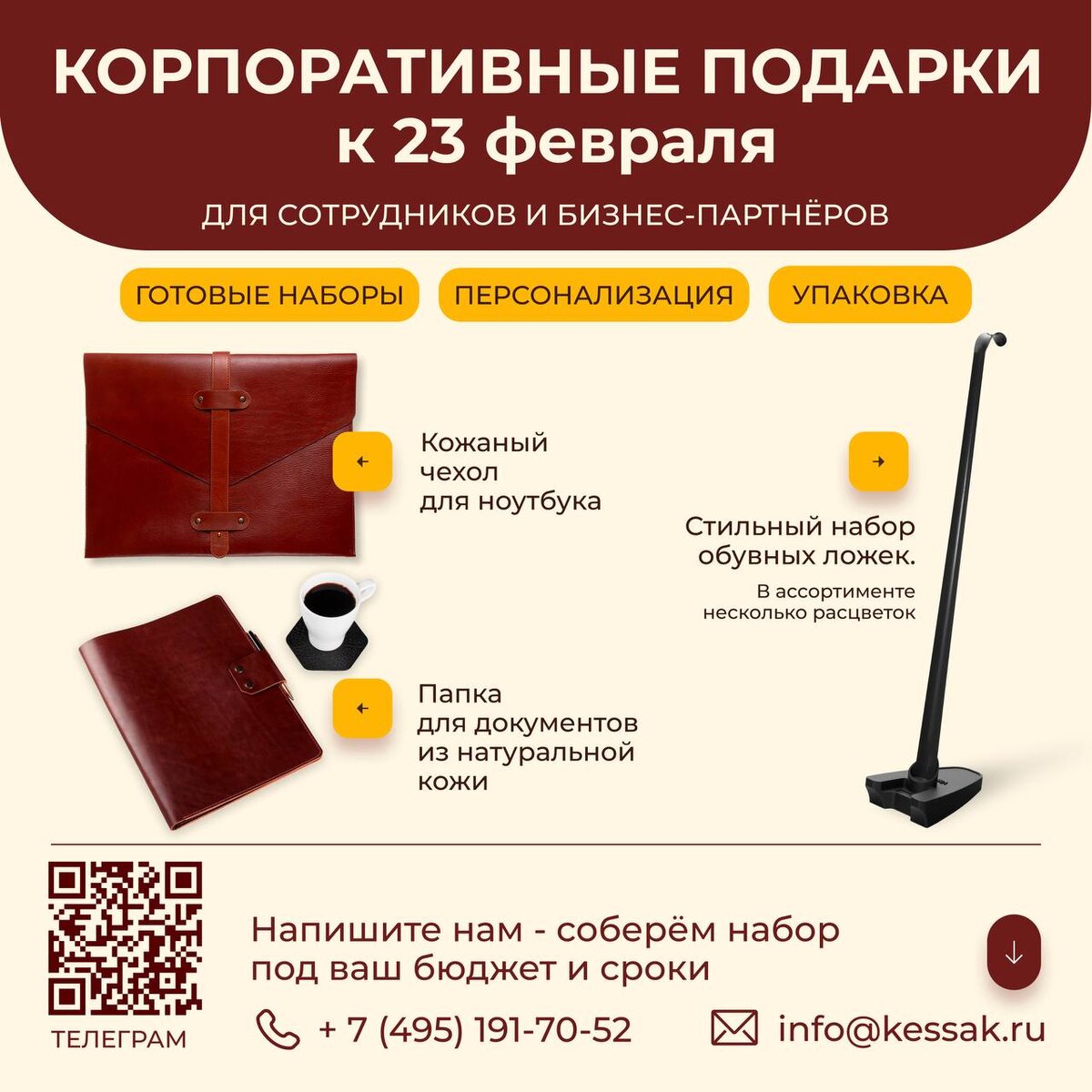 💼 🔔 Большой выбор изделий. Под разные бюджеты и задачи. 🔔 Минимальные сроки. Оперативное производство и быстрая отгрузка. 🔔 Брендирование. Нанесение логотипа и символики компании. 🔔 Удобная оплата. Работа по договору и разные способы оплаты. Если важно сделать подарок, который не затеряется среди стандартных решений, мы поможем подобрать вариант, который запомнится. Будем рады помочь с подбором, просто напишите нам.