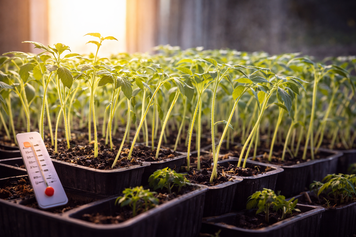 В таких условиях даже фитосвет не компенсирует перегрев. Растение продолжает «спешить». В феврале рассаде нужна формула: много света + умеренная прохлада = крепкая структура После всходов: Да, дома это сложно, но: Это сразу тормозит вытягивание. Фитолампа должна быть: Свет сбоку = вытягивание к источнику. Азот уси