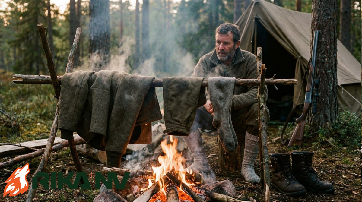 Сушка у огня кажется простой, но именно тут чаще всего портят вещи. Искры, перегрев и неравномерное тепло делают своё дело. Правильная сушка — это расстояние, время и контроль. Ошибка стоит дорого. Не вешай одежду прямо над пламенем. Оптимально — сбоку, на уровне теплового потока. Расстояние должно позволять держать руку без боли. Синтетика требует большего удаления, чем шерсть. Вешай вещи свободно, без складок. Используй ветки или верёвку, а не палки в огне. Проверяй направление ветра постоянно. Искры летят именно по ветру. Меняй позицию при изменении тяги. Это снижает риск прожога. Сначала дай одежде откапать воду. Выверни влажные зоны наружу. Начинай с умеренного тепла, а не максимума. Регулярно переворачивай и меняй стороны. Проверяй ткань рукой каждые 5–10 минут. Если ткань горячая — это плохо. Синтетику лучше подсушивать этапами. Не оставляй вещи без присмотра. Даже одна искра прожигает мембрану. Контроль важнее скорости. Не суши вещи в дыму, это закрепляет запах. Старайся, чтобы