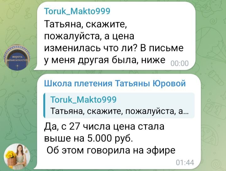 ! Дорогие друзья, к сожалению вчера цена на курс «Ротанговый рай» выросла! Мы всегда стараемся несколько раз напомнить, и здесь, в канале, и в рассылках по почте, Телеграм и ВКонтакте, кажется не отправляем только в космос🚀 👌Хотим дотянуться до всех-всех-всех желающих, чтобы у всех вовремя получилось увидеть самые выгодные цены на наши обучающие программы Но постоянно находятся люди, которые не увидели, не успели, отвлеклись и все пропустили🤷♀️ Ещё обиднее, когда набор на поток мы уже закрыли, а люди хотели на курс, ждали анонсов, даже планировали попасть на конкретный поток и .... ВСЁ РАВНО ПРОПУСТИЛИ 😱 Ну как так? Вам повезло, набор-то ещё открыт! Да, цена подросла, но попасть на курс «Ротанговый рай» можно 🙌 Заходите сейчас, мы закрываем набор В КОНЦЕ ЭТОЙ НЕДЕЛИ! Прикрепляем ещё раз ссылку на сайт, выбирайте тариф, который понравится больше: https://loza-school.ru/tarifrotang?utm_source=tg&utm_medium=channel&utm_campaign=tunnel-rotang_0126&utm_content=sale&utm_term=r