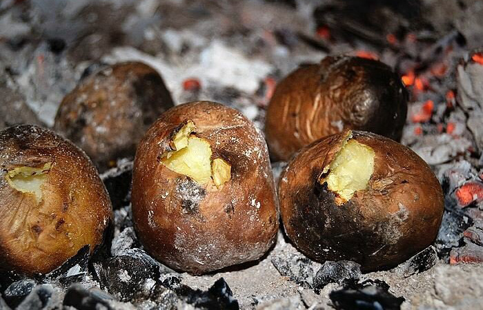 В фольге Хорошенько помять картошку, кожу не снимать. Завернуть каждый клубень в фольгу. Уложить на разогретые угли. Сверху можно спокойно жарить шашлык. Печь 10 минут, после чего перевернуть и еще печь 5-7 минут с другой стороны. В золе В уже догоревшие до состояния золы угли зарыть предварительно вымытый картофель, готовить 20-25 минут. Есть, разрезав пополам, с солью и маслом.