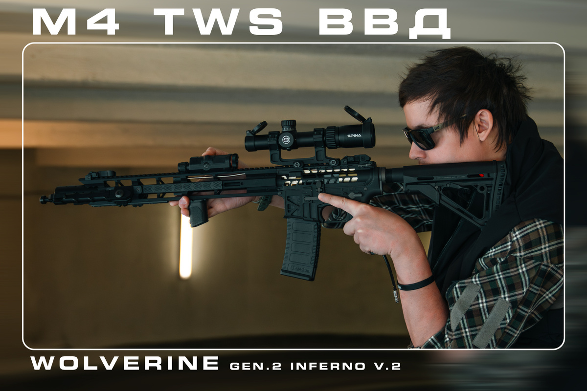 Продолжаем рассказывать про интересные проекты от наших мастеров. В этот раз мы собрали ВВД-автомат на системе WOLVERINE. Этот проект интересен не только тем, что работает на воздухе высокого давления, но и своим подходом к внешнему тюнингу. Начнем обзор с внешнего вида. За основу взят премиальный корпус M4 TWS от King Arms. Автоматы этого производителя в представлении не нуждаются: внешний вид, качество материалов и эксклюзивность делают эту платформу отличной базой. Мы решили пойти дальше и собрали автомат в концепции спортивной винтовки. Корпус здесь скелетный, поэтому выезжать с ним в грязный лес — затея рискованная, так как собрать внутрь грязь полигона будет слишком легко. Впрочем, качество сборки King Arms позволяет пережить и это, но стихия этого оружия — здания и чистые площадки. Скелетное цевье длиной 13 дюймов мы использовали по полной программе. Для максимальной универсальности установили и регулируемые сошки, и тактическую рукоять. Благодаря этому автомат комфортен как для