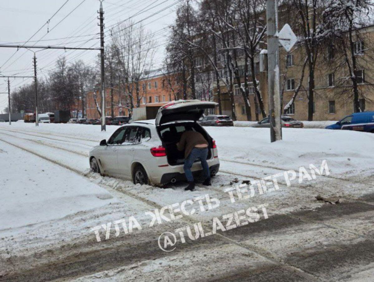 В Туле на Щегловской засеке автомобиль застрял на трамвайных путях