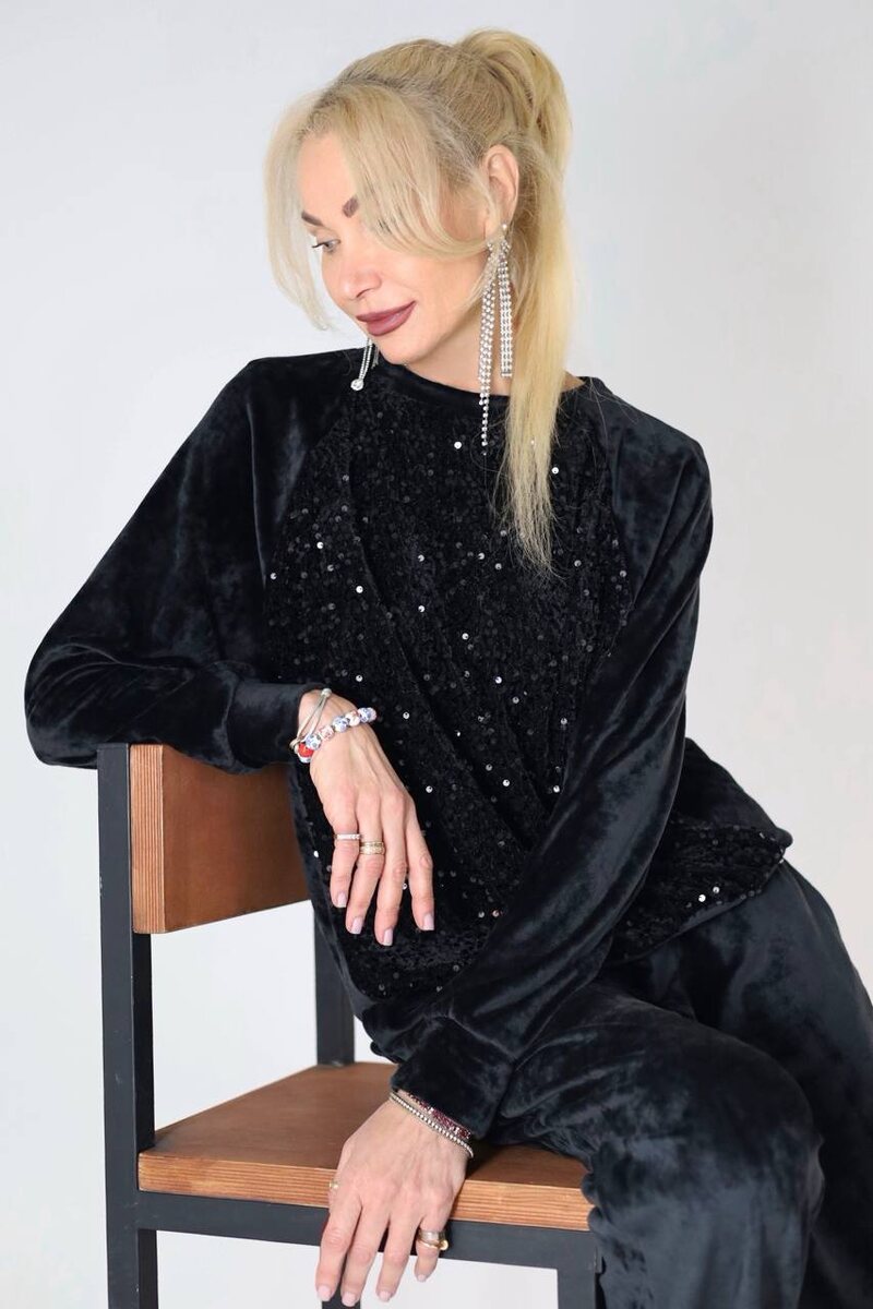 Если вы предпочитаете брючные варианты и более строгие, сдержанные, но не менее блестящие образы, у нас в наличии есть велюровый костюм с