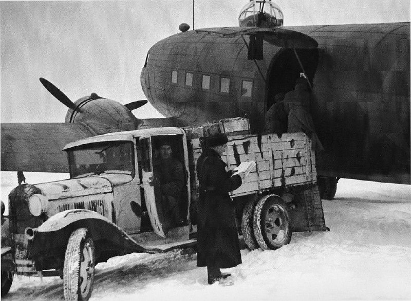 Выгрузка продовольствия для блокадного Ленинграда из транспортного самолета Ли-2. 1942 год.